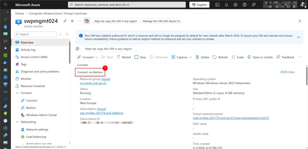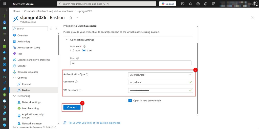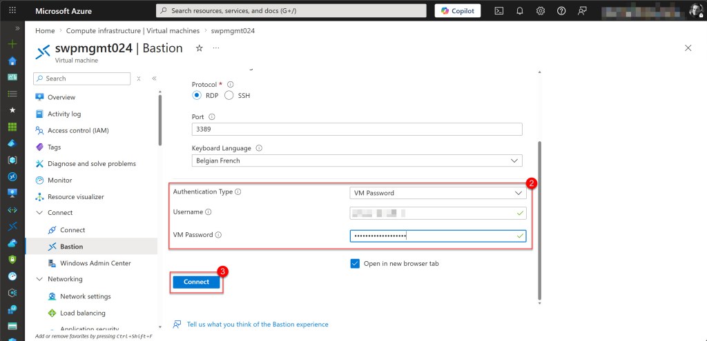 In the Azure Portal (you can use the normal Azure Portal again), navigate to your Windows virtual machine, click Connect, and select Bastion as the connection method. Enter your VM credentials, then click Connect to establish the session.