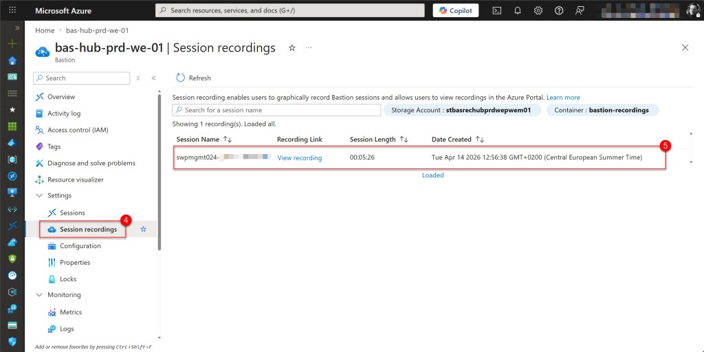 Once the session is closed, wait 1-2 minutes for the recording to be processed and uploaded to the storage account. Then there are two ways to verify that the recording was captured successfully.