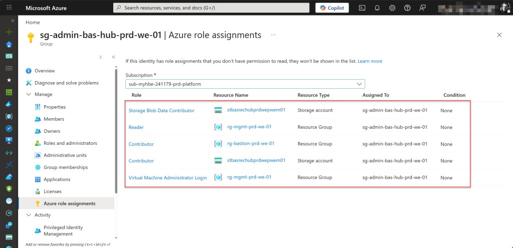 - An Azure account with the Contributor role (preferably assigned via a Security Group) to create the Storage Account and modify Azure Bastion settings, as well as the Storage Blob Data Contributor role* to manage and view the recorded session data. Additionally, the Virtual Machine Administrator Login (or Virtual Machine User Login) and Reader roles are required on the resource group containing the VMs to enable Bastion connectivity.