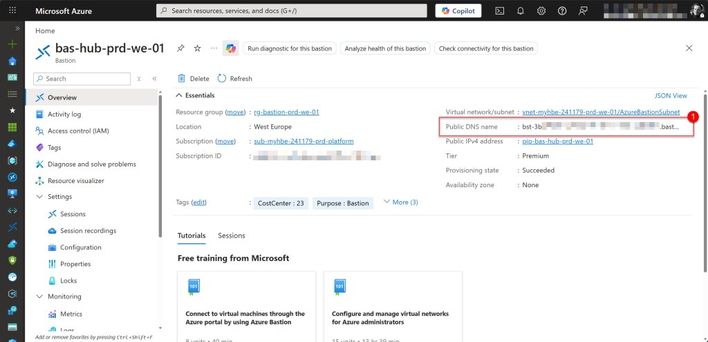 Sign in to the Azure Portal and open your Azure Bastion resource. On the Overview page, locate the Public DNS name and copy it. The DNS name follows the format bst-xxxxxxxx-xxxx-xxxx-xxxx-xxxxxxxxxxxx.bastion.azure.com.