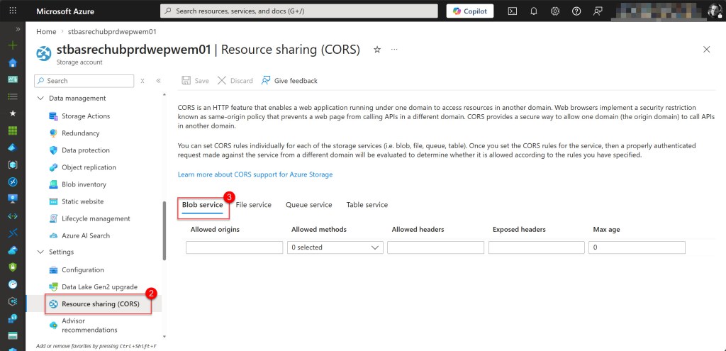 Now you can configure the CORS policy on your storage account. In the Azure portal, navigate to your storage account. In the left-hand navigation pane, under Settings, select Resource sharing (CORS), then open the Blob service tab.