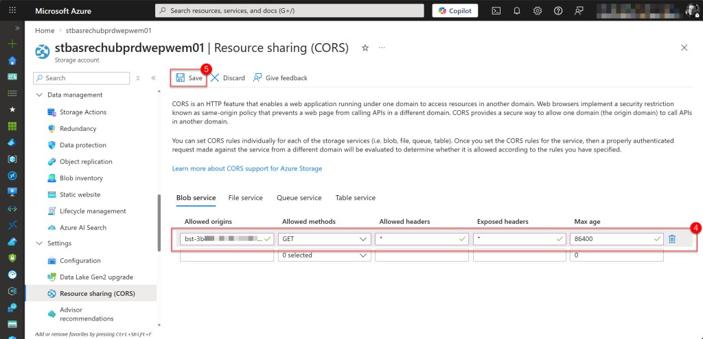 Create a CORS rule using the values below. Then click Save at the top of the page to apply the policy.