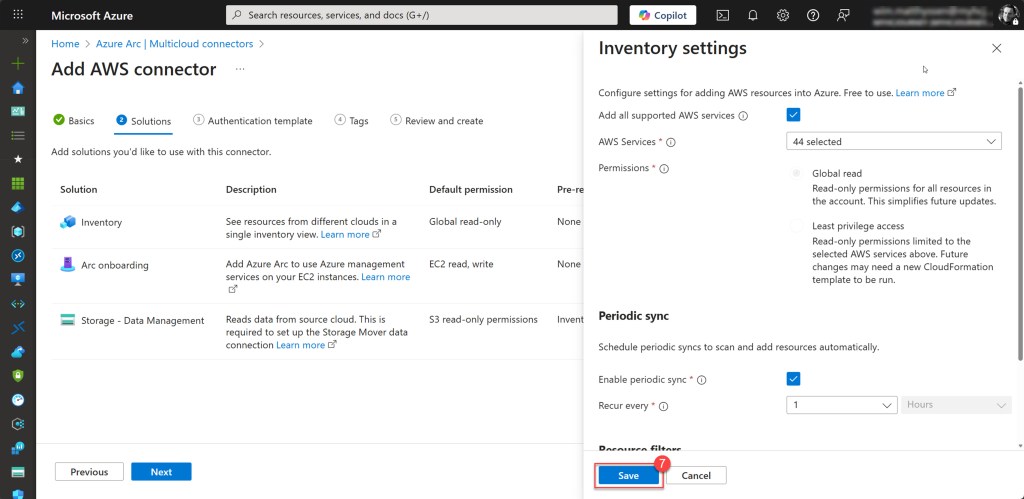 On the Add AWS connector blade, click + Add in the Inventory section. Next, configure the inventory settings and click Save when you’re done. This includes selecting the AWS services to inventory, defining the Periodic sync frequency (how often the scan should run), and specifying the AWS regions to include.