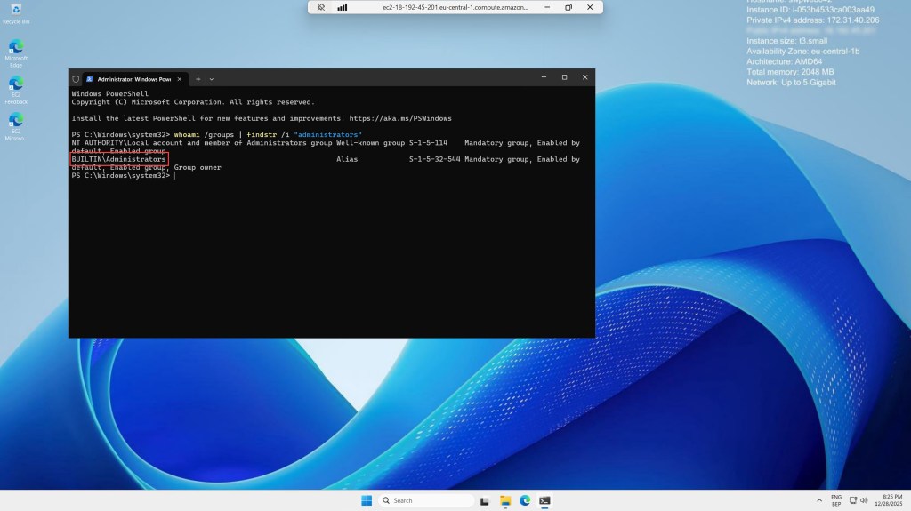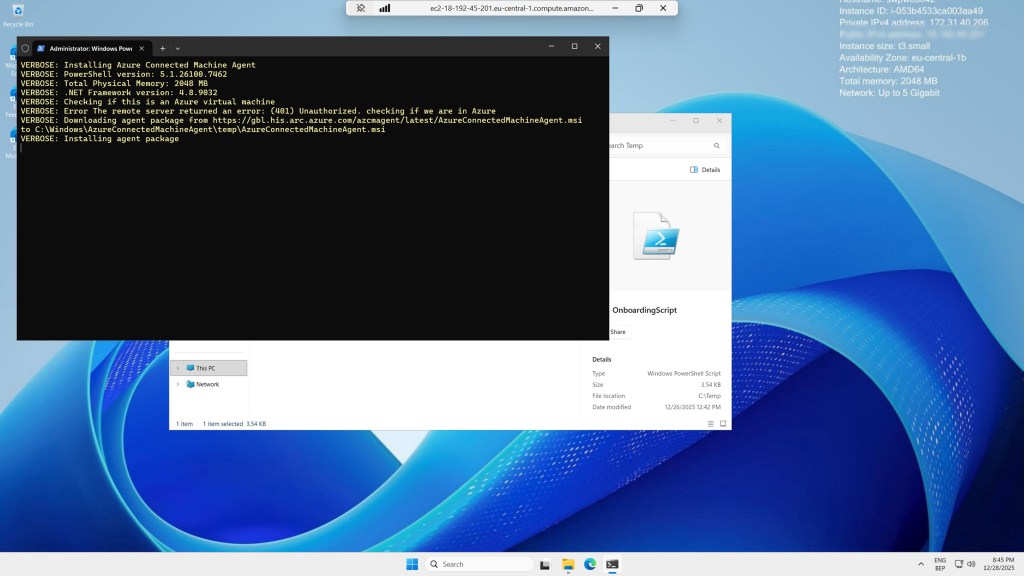 - One or more EC2 instances (AWS VMs) running a Windows Server operating system (for example, Windows Server 2025) that are already running and available. These VMs will be connected to Azure Arc, so ensure they are properly configured and accessible before you begin.
