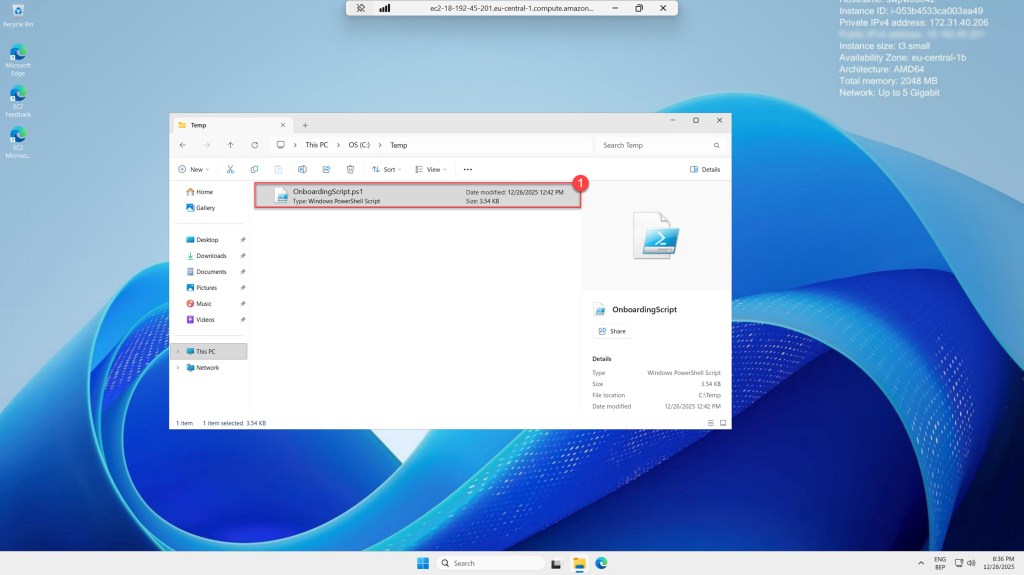 To start, RDP into one of your AWS VMs and log in as a user with administrator rights. Then, copy your onboarding script to a folder. I usually use the Temp folder.
