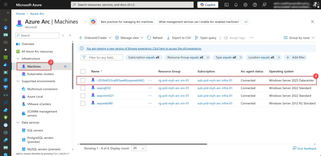If the script completes without any errors, you can check the Azure Arc blade to see if the AWS VM has been successfully onboarded. To do this, go to the Azure Arc blade and look under ‘Machines‘. You should find the newly onboarded AWS VM there.