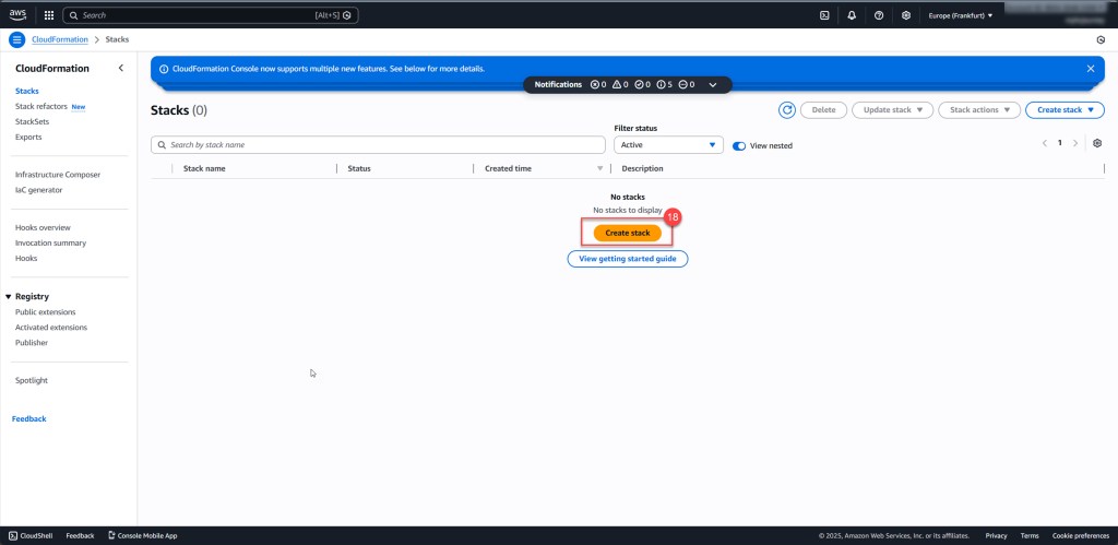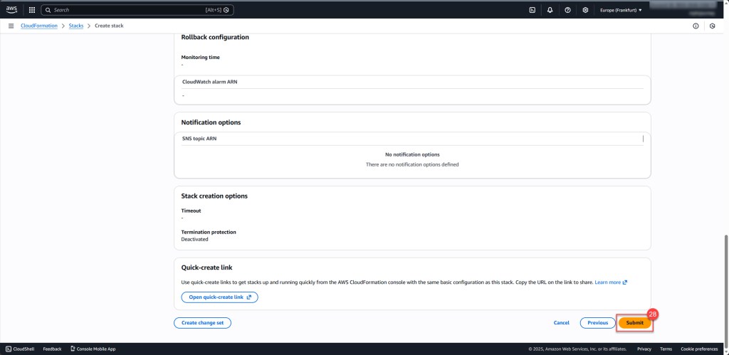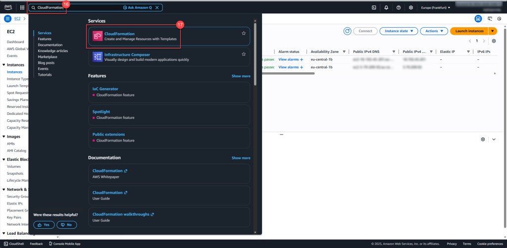 The final step is to upload the template to your AWS environment. To do this, log in to your AWS account, type CloudFormation in the search bar, and click on it when it appears.