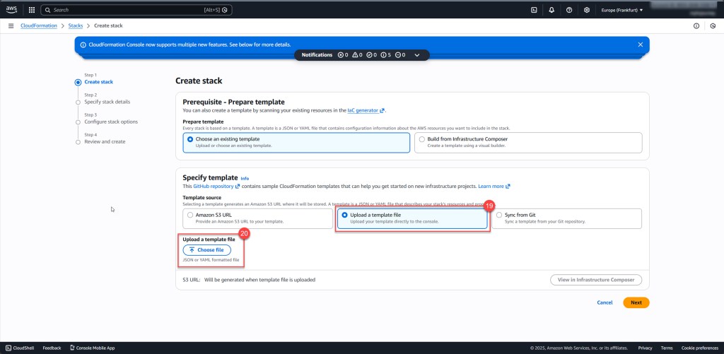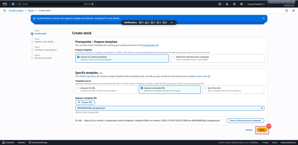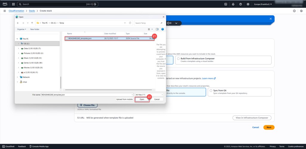 In the next blade, the template* you just generated, which includes all the settings you configured earlier, can be downloaded and later uploaded to AWS CloudFormation as a stack to automatically create the required resources. Click Download template to save it in a central or easily accessible location for later use. When you’re ready, click Next to continue.