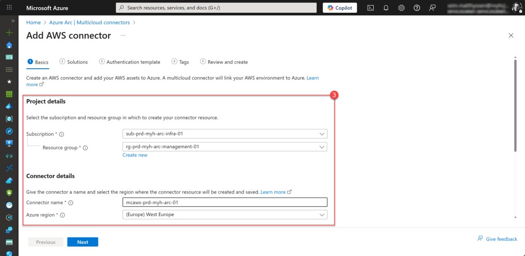 On the opened blade, fill in the Project details by selecting the correct subscription and resource group. Then complete the Connector details by specifying a connector name that follows your Azure naming convention and selecting the appropriate Azure region*.