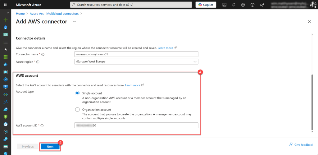 Then scroll down on the same blade and fill in your AWS account details by selecting the account type (in my case, I chose Single Account) and entering your correct 12-character AWS account ID. Click Next when finished.