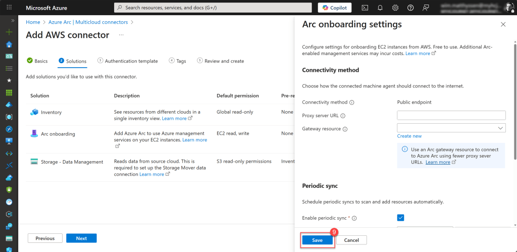 In this step, you’ll specify the connectivity method, choosing whether your instances connect via a public endpoint, a proxy server, or an Azure Arc gateway resource, and set the periodic sync interval, just like in the previous configuration.