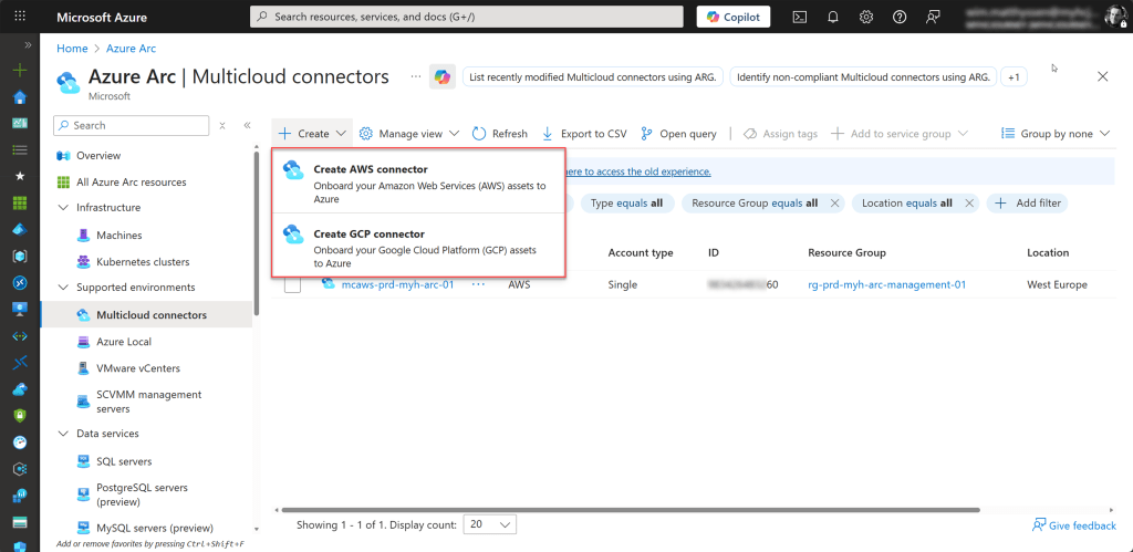 To start, open the Arc blade and go to Multicloud connectors under Supported environments. Then click on Create and select Create AWS connector.