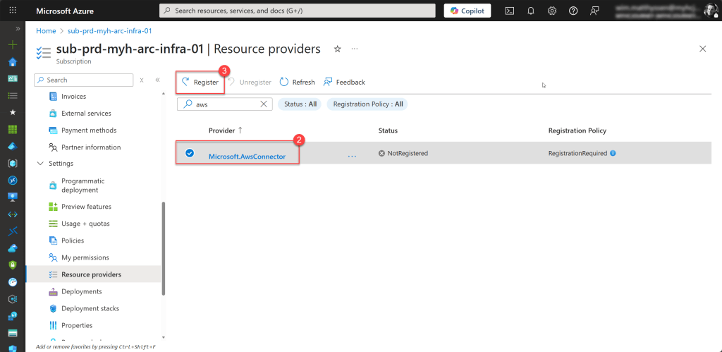 To do so, go to the subscription via the Global Search bar, then navigate to Resource providers. In the search bar of the opened blade, type “aws“.
