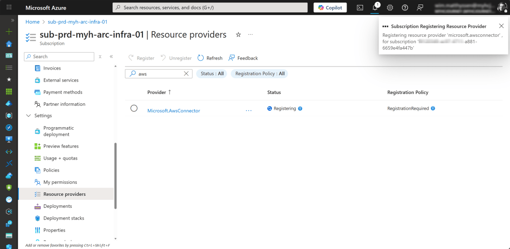 If you want to inventory and/or Arc-onboard AWS VMs into an existing subscription (landing zone) already used for your Arc-enabled resources via the AWS Multicloud Connector, most required resource providers, such as Microsoft.HybridCompute and Microsoft.HybridConnectivity, are likely already registered.