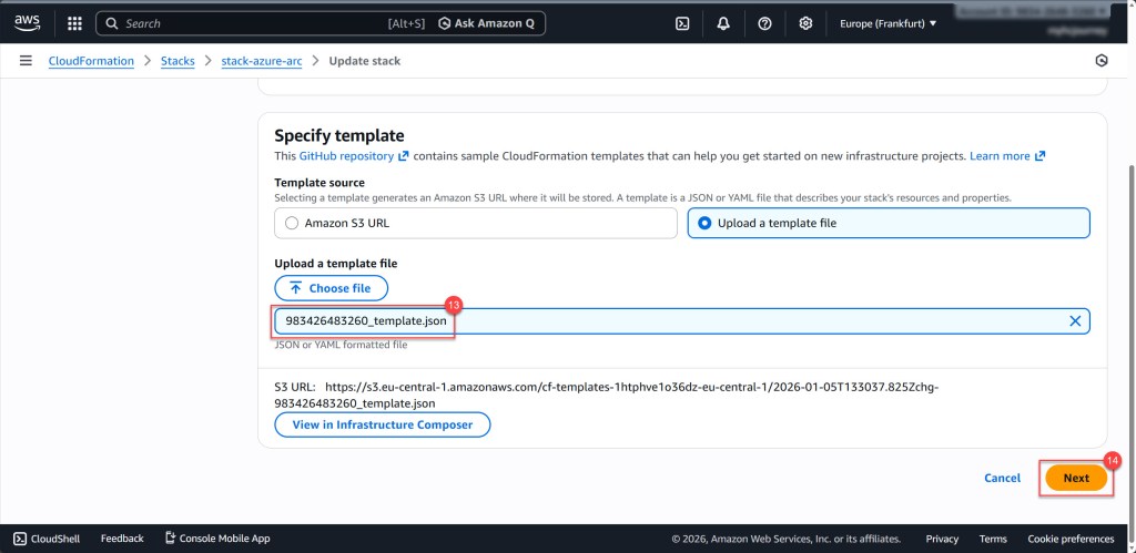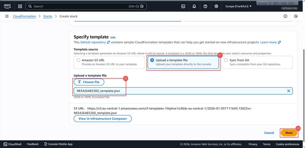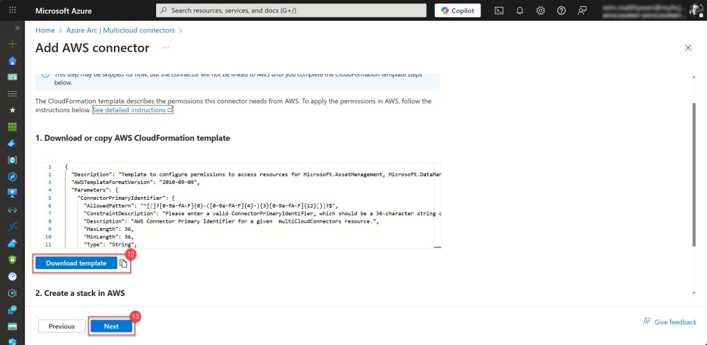 In the next blade, the template you just generated, which includes all the settings configured earlier, can be downloaded and later uploaded to AWS CloudFormation as a stack to automatically create the required resources. Click Download template to save it in a central or easily accessible location for later use. When ready, click Next to continue.