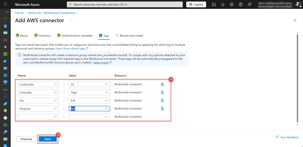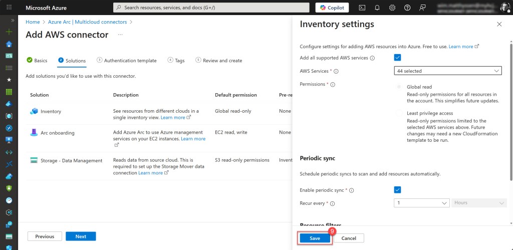 o get started, open the Azure Arc blade and navigate to Multicloud connectors under Supported environments. Then click Create and select Create AWS connector.