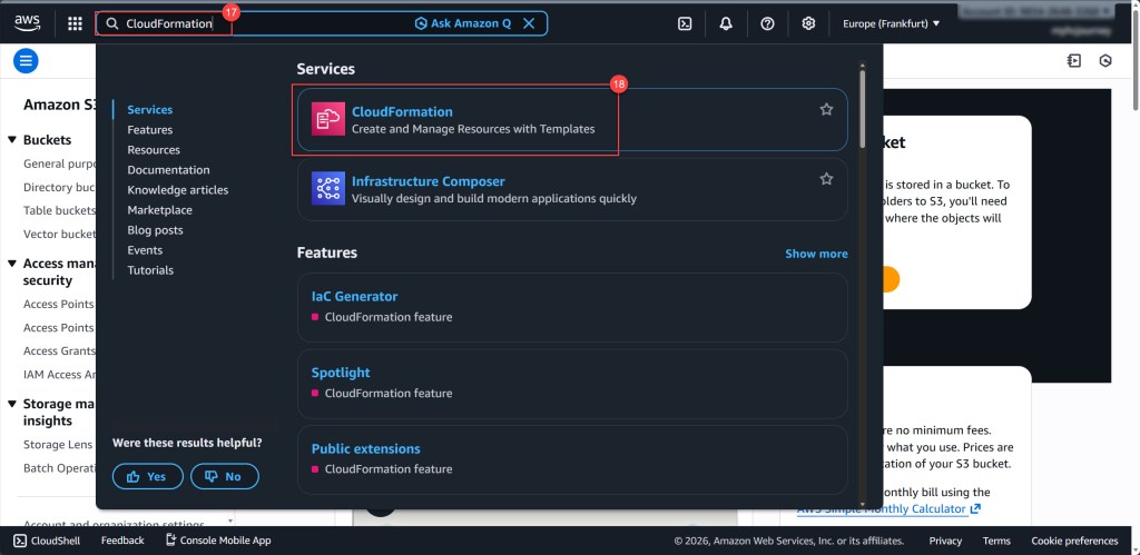 The final step is to upload your template to AWS. Start by signing in to the AWS Management Console, then type “CloudFormation” into the search bar at the top and select it from the results.