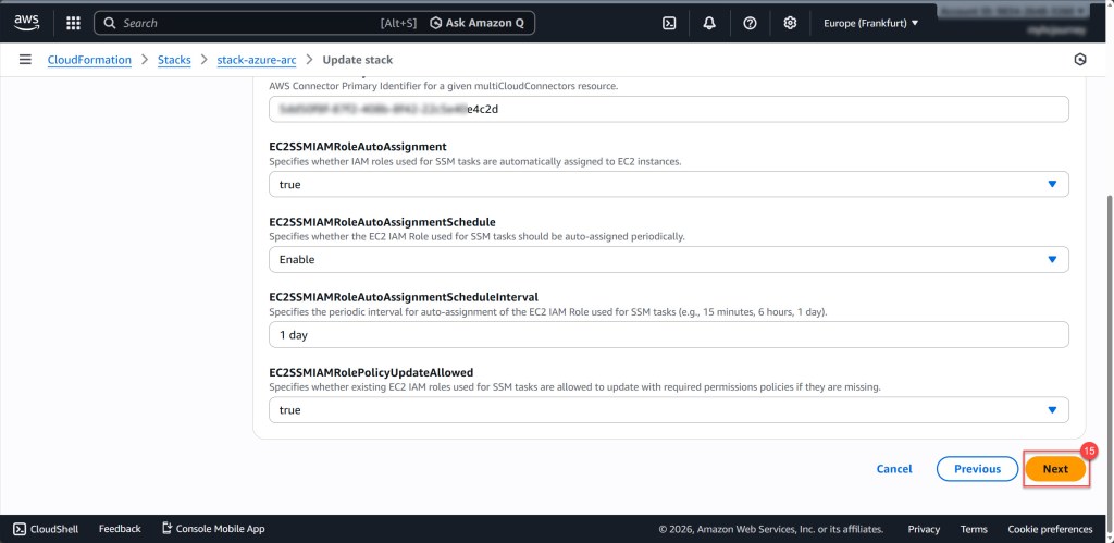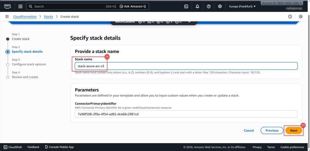 Give your stack a descriptive name that follows your AWS naming conventions, then scroll down and click Next. On this screen, you’ll also see that the ConnectorPrimaryIdentifier parameter is automatically filled in for you.