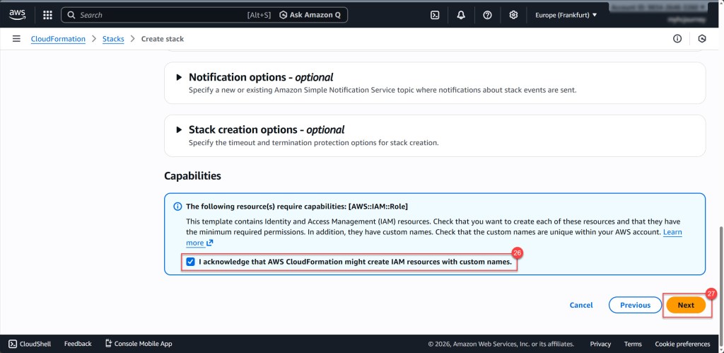 On the next screen, you can configure options like Tags, Permissions, and other settings. For now, leave everything at its default values, check the box acknowledging that AWS CloudFormation might create IAM resources with custom names, and then click Next to continue.