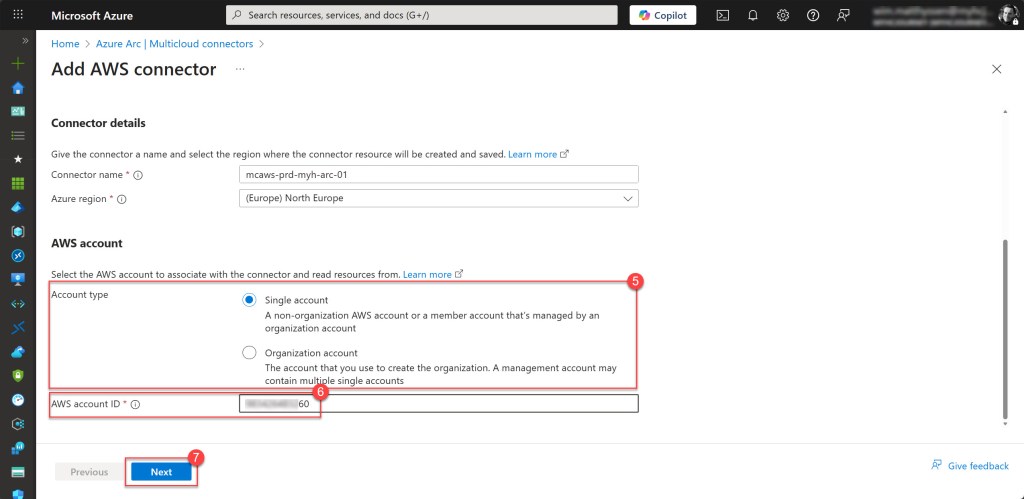 Scroll down to the AWS account details section. Select the account type (for example, Single Account) and enter your 12-digit AWS account ID. Make sure you know your account ID before continuing. Click Next when finished.