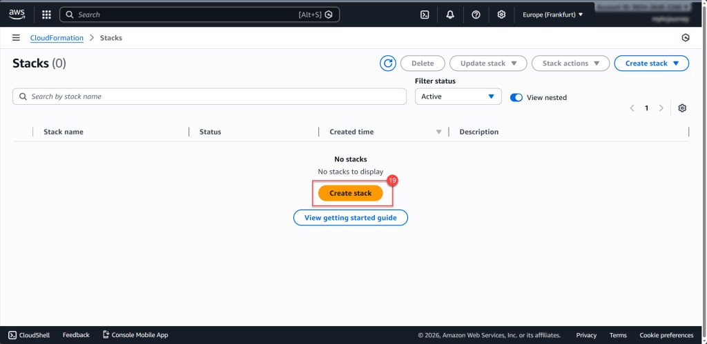 Once the CloudFormation page opens, click Create stack to get started. If prompted, select With new resources (standard) to set up a new connection.
