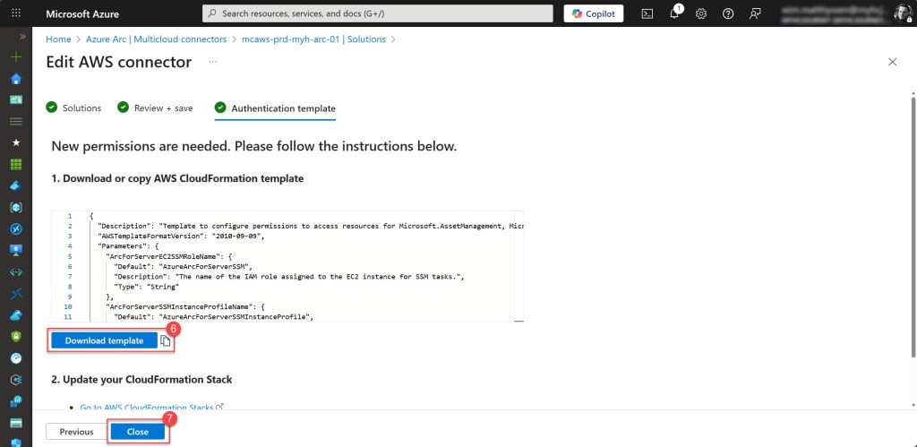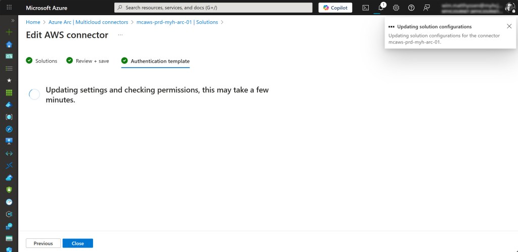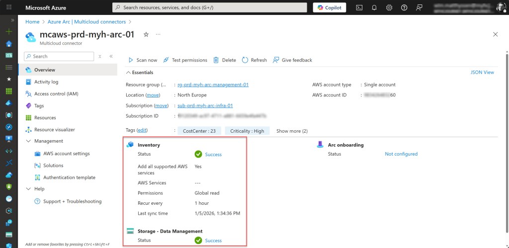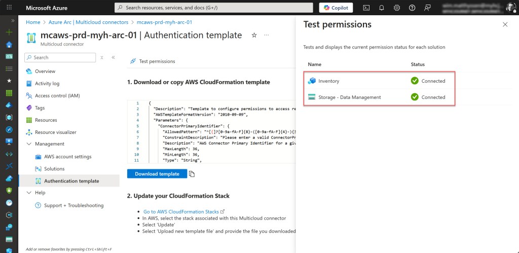 Once the stack is successfully created, go back to the Arc blade in the Azure portal and select the newly created Multicloud connector. On the opened blade, under Management, choose Authentication template and click “Test permissions” to verify that the connection you just created is working correctly.