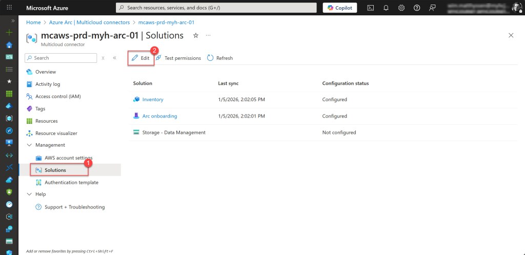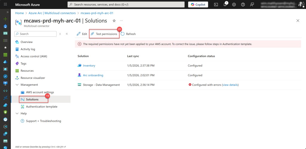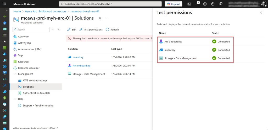 Once the update is complete, return to the Arc blade in the Azure portal and select your AWS Multicloud connector. On the opened blade, under Management, choose Solutions and click Test permissions to verify that the updated connection is working correctly.