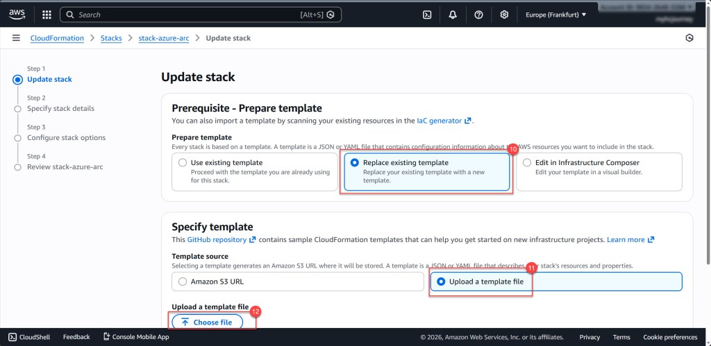 On the Update stack page, select Replace existing template, then choose Upload a template file and click Choose file.