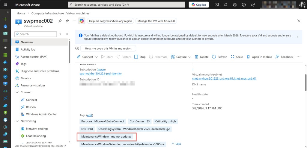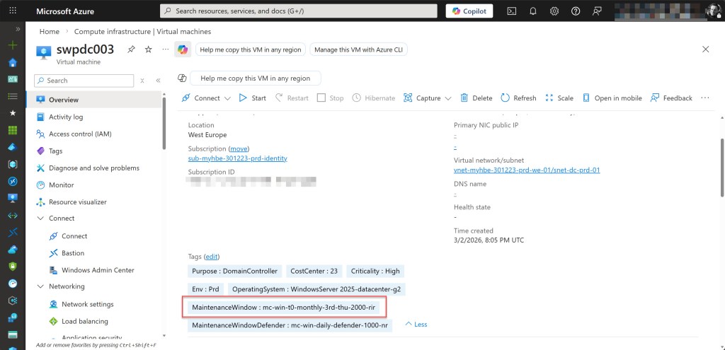 💡 Keep in mind that a resource can only have one value per tag name. That is why this setup uses two separate tag names: MaintenanceWindow for the regular monthly patch window and MaintenanceWindowDefender for the daily Microsoft Defender updates. This allows both tags to coexist on the same VM, enabling it to be targeted by two different Maintenance Configurations simultaneously without conflict.