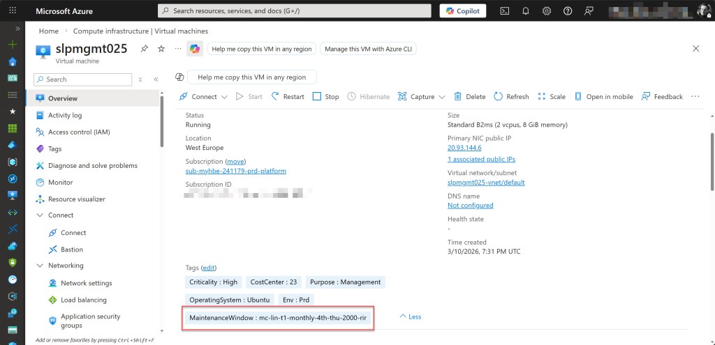 💡 I use mc- as a prefix in all tag values to enable Azure Policy wildcard matching (for example mc-*). This makes it easy to target all maintenance-related tags with a single policy rule.