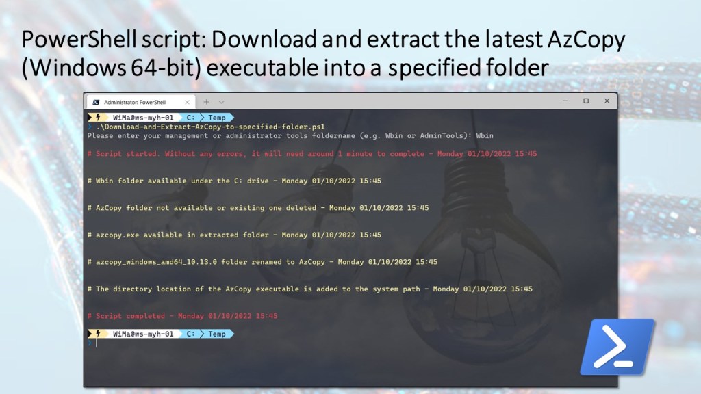 PowerShell script: Download and extract the latest AzCopy (Windows 64-bit) executable into a specified folder